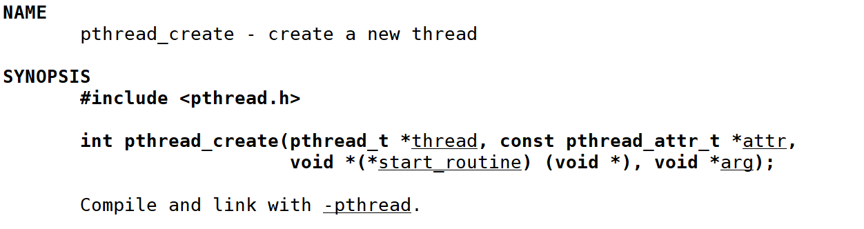 int pthread_create(pthread_t *thread, const pthread_attr_t *attr, void *(*start_routine) (void*), void *arg);