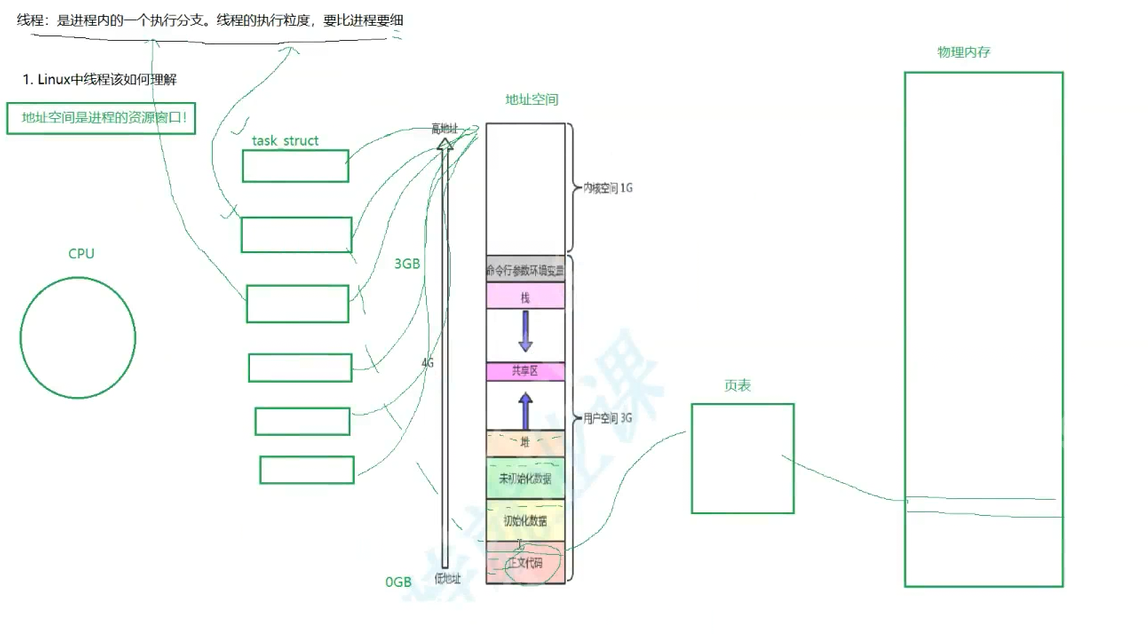 其实线程也是一个子进程,当然他也有自己的task_struct,但是他没有自己独立的地址空间和页表,他和父进程共用一个地址空间和页表,正文代码部分分一部分给这个进程,这个进程被称为线程