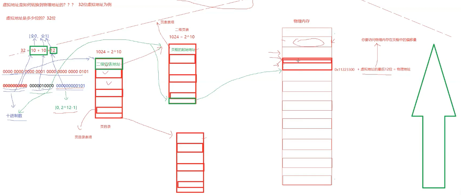 下面这张图就是cpu中得到的虚拟地址如何转化为物理地址(读进cpu内部的地址是虚拟地址)32位机器的地址大小为4字节,32个比特位,cpu将这32个比特位分为10-10-12 三个部分,
