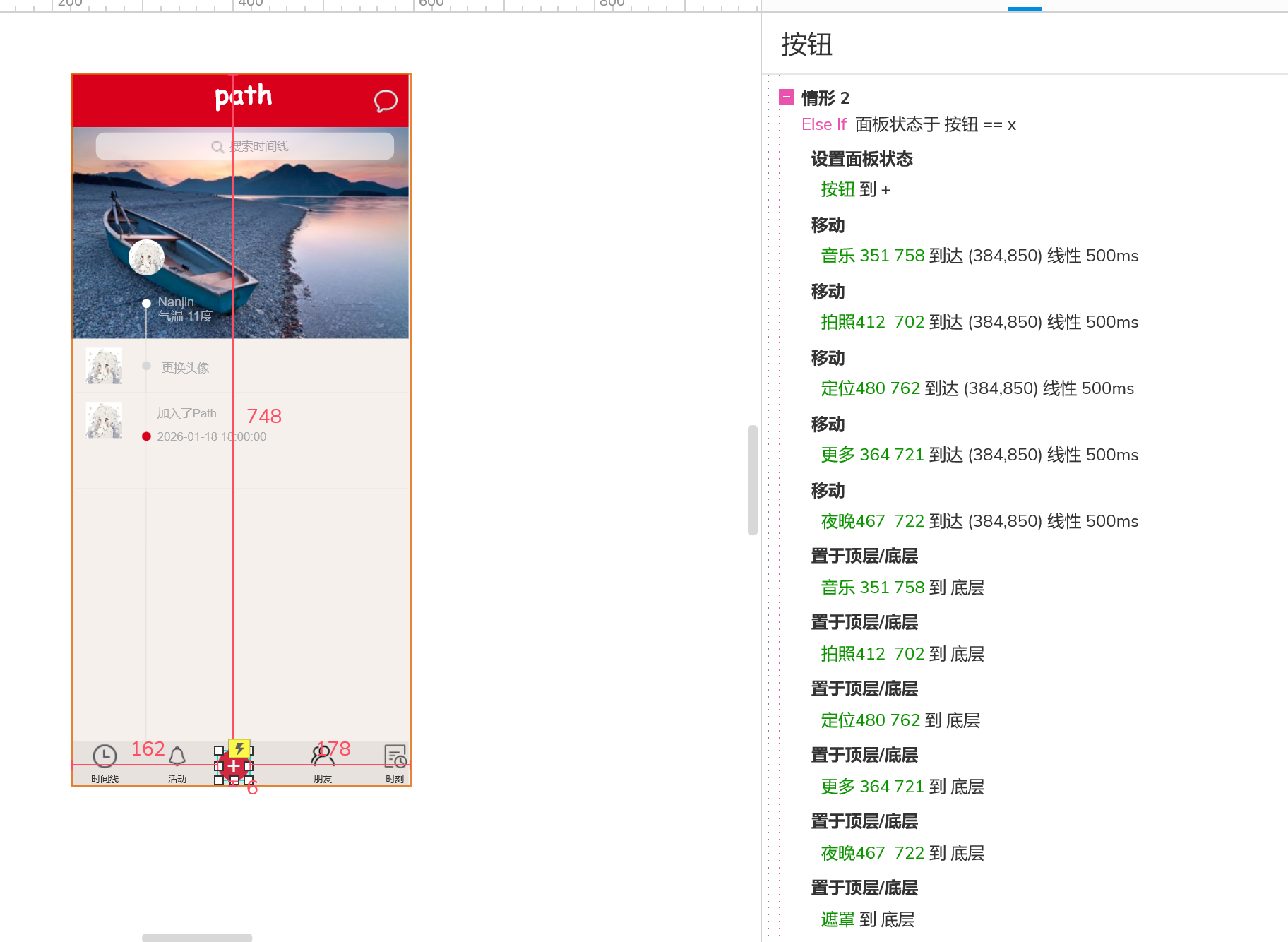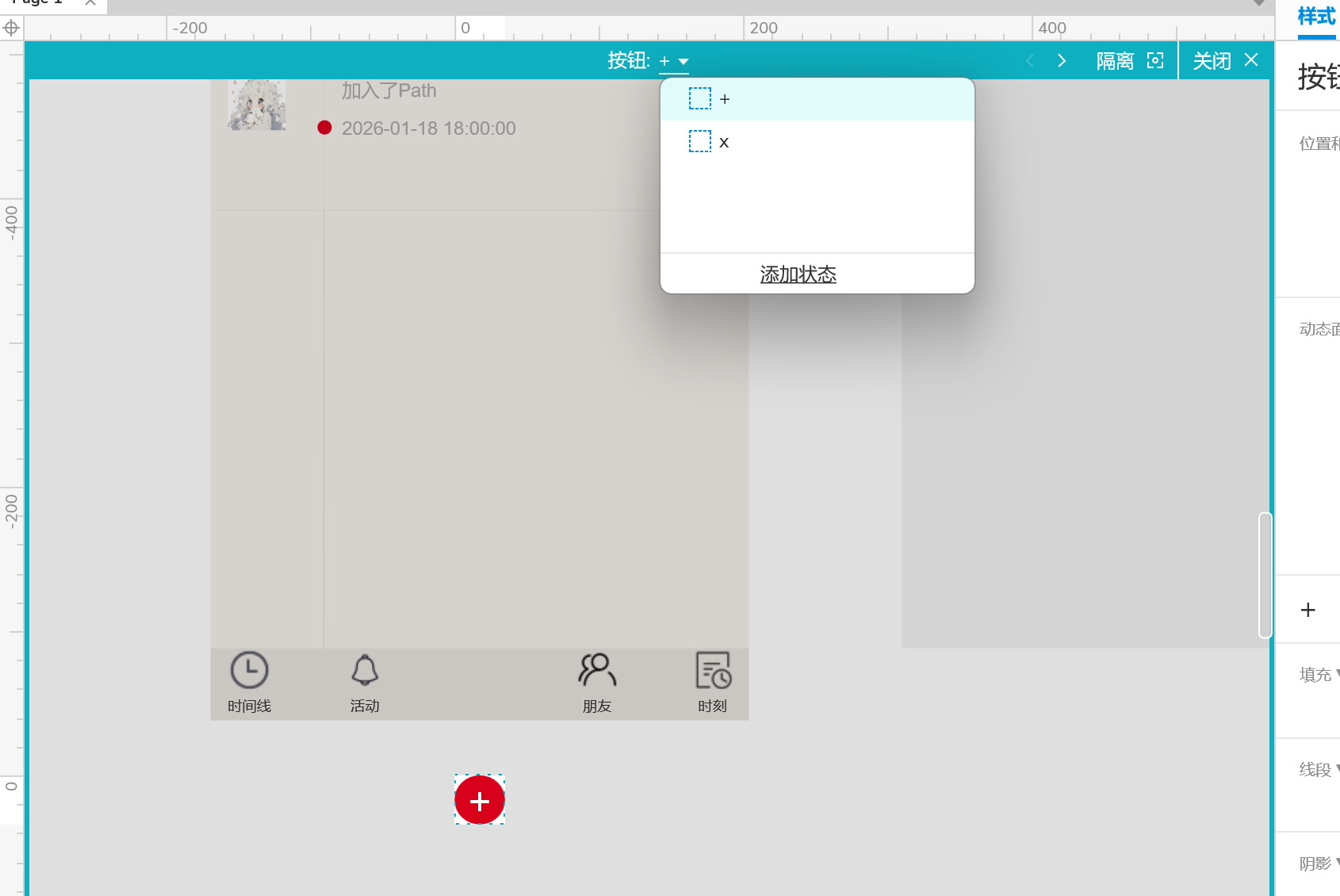 2、将页面底部的红色添加转换为动态面板,并命名为【按钮】,并将其设置为两种样式,一种为点击前的样式,一种为点击后的样式。点击前中间的样式为+,点击后中间的样式为X。