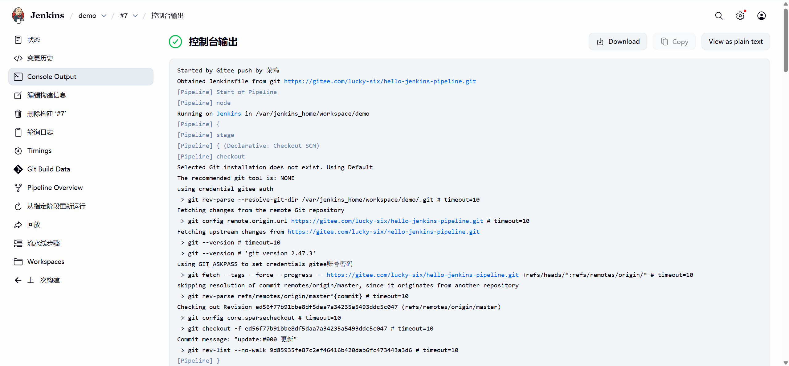 git push代码。 - 触发通知:Gitee 通过 Webhook 通知 Jenkins "有新代码了"。