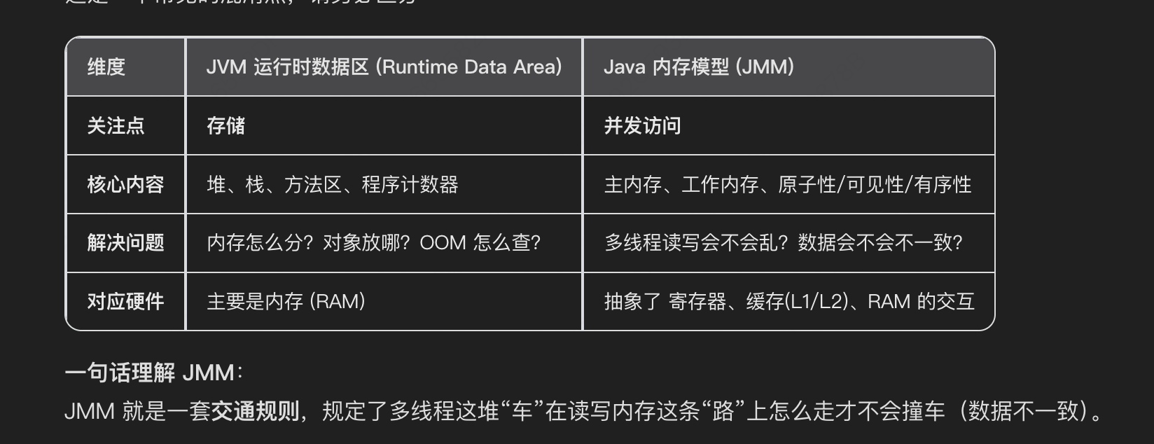 JMM:描述的是多线程并发下的访问规则(即"线程怎么读写")。