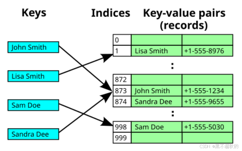 图中John Smith 和 Sandra Dee(两人都哈希到单元格 873)之间的冲突通过将 Sandra Dee 放置在下一个空闲位置(单元格 874)来解决。