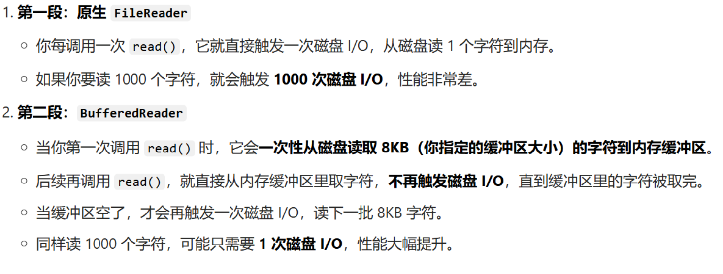 它在内存中开辟一块缓冲区(默认 8KB),写入数据时先存到缓冲区,只有当缓冲区写满、调用 flush() 或关闭流时,才会一次性把缓冲区的数据刷到磁盘 这样减少磁盘 I/O 次数,提升写入性能 减少了因频繁 I/O 中断导致的数据损坏概率