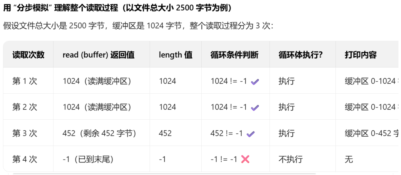 //read(buffer) 方法返回的是 "实际读取的字节数"(不是缓冲区长度),当文件读到末尾时返回 -1