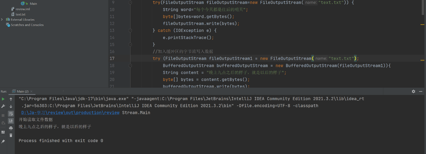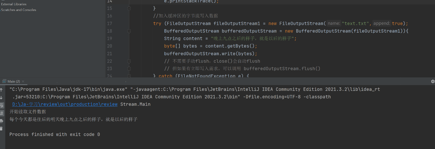 这样的话呢就会进行追加写入 FileOutputStream默认是覆盖数据,在构造方法第二个参数加入true 就会变成追加模式