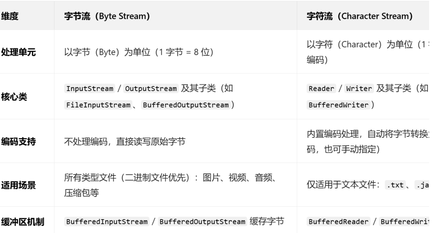 字符流:在字节流的基础上增加了编码解码层 读取时,先把字节读入缓冲区,再按指定编码(如 UTF-8)转成字符;写入时,先把字符按编码转成字节,再写入磁盘