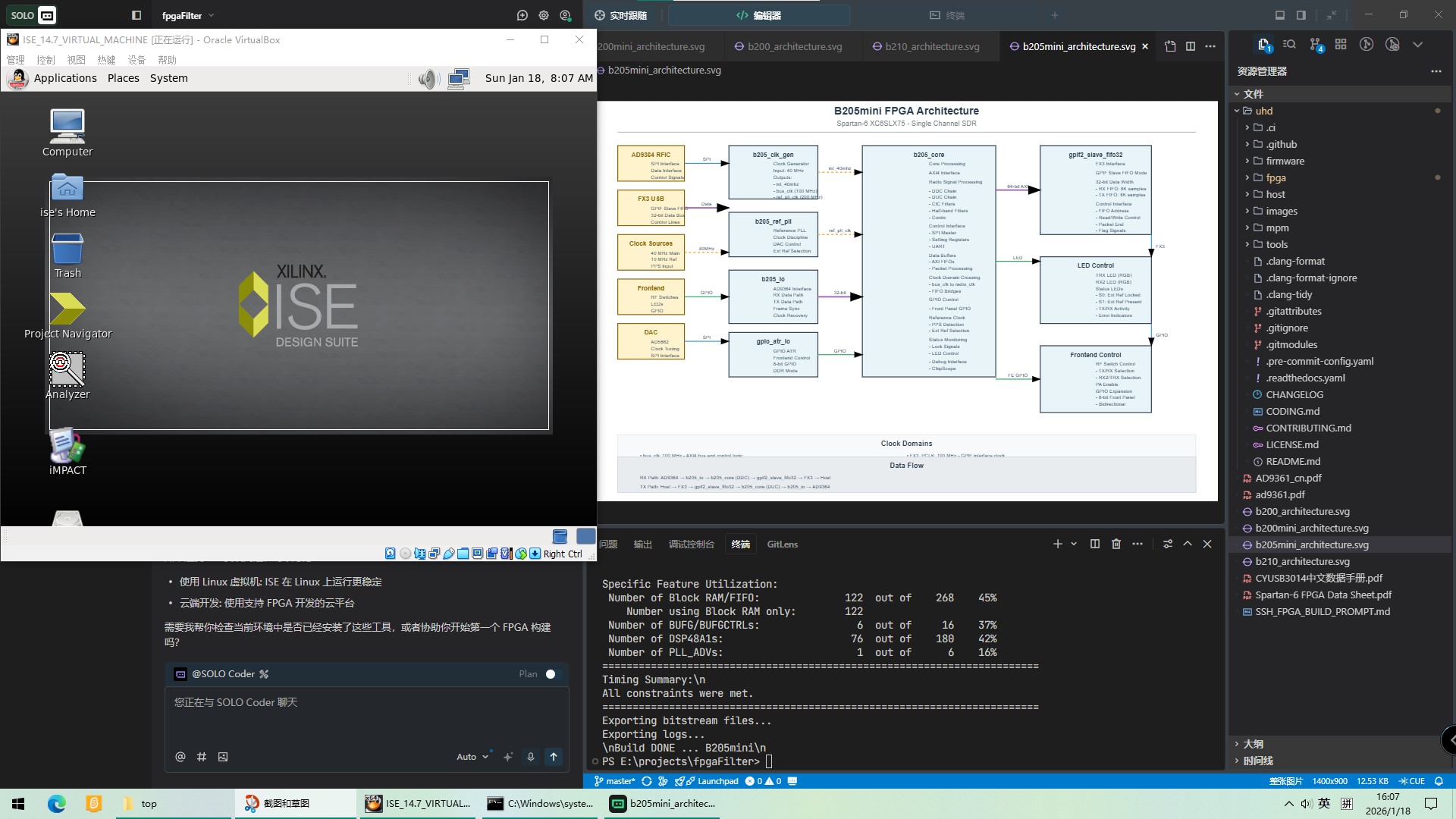 近期,采用ISE 环境结合AI Trae,成功自动化编译了USRP B210/B205系列的FPGA工程,并在AI的协助下,初步了解了工程的结构,自动化产生了Bits, 下面把内容总结如下。
