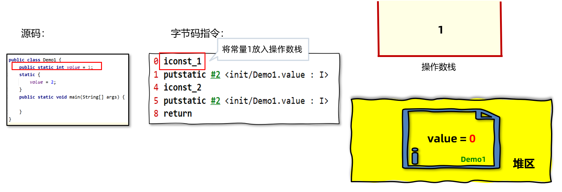 iconst_1,将常量1放入操作数栈。此时栈中只有1这个数