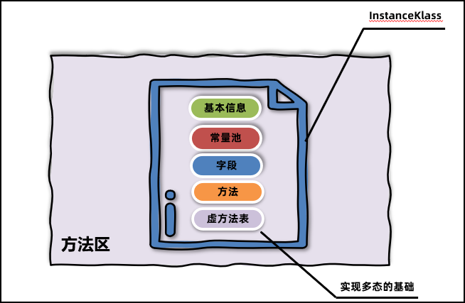 2、类加载器在 加载完类之后,Java虚拟机会 将字节码中的信息保存到方法区中,方法区 中生成一个 InstanceKlass 对象 ,保存类的所有信息,里边还包含实现特定功能比如 多态的信息(虚方法表)