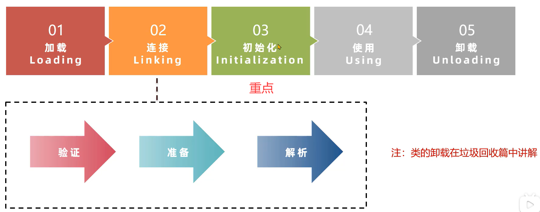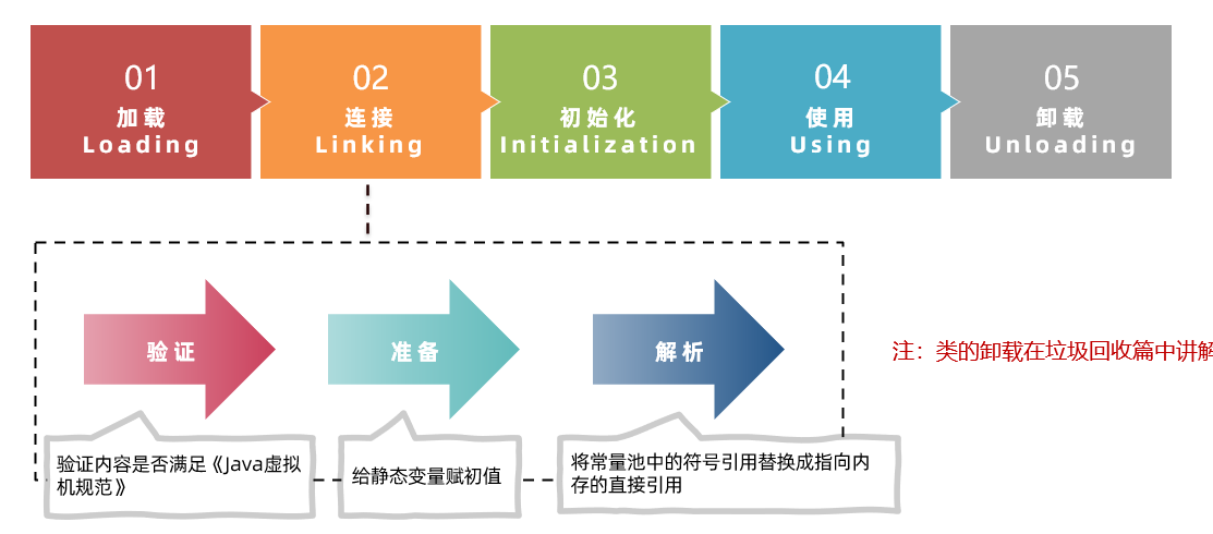 类的生命周期描述了一个类加载、使用、卸载的整个过程,生命周期如图所示: