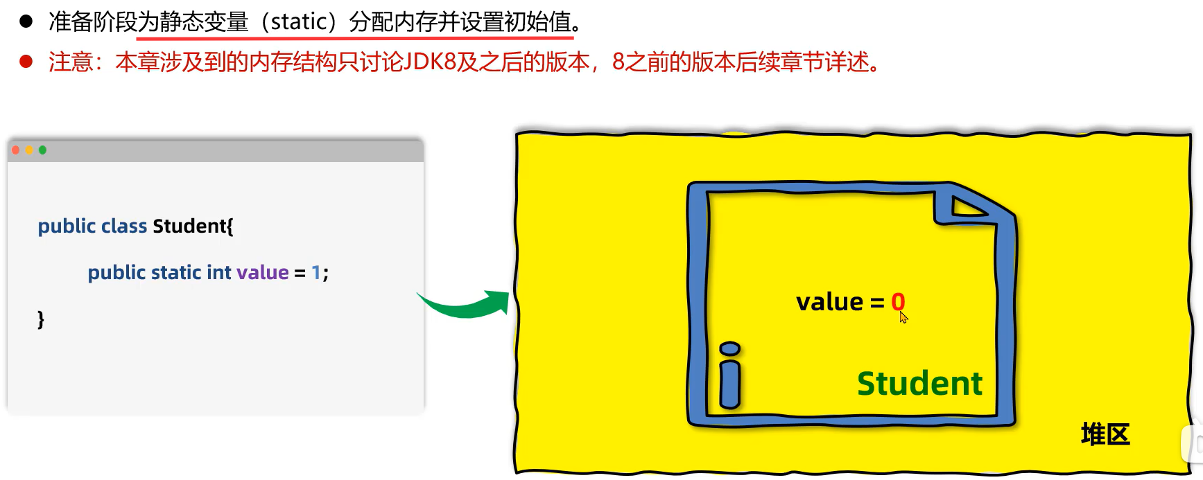 - 在准备阶段会 为value分配内存并赋初值为0,在 初始化阶段才会将值修改为1