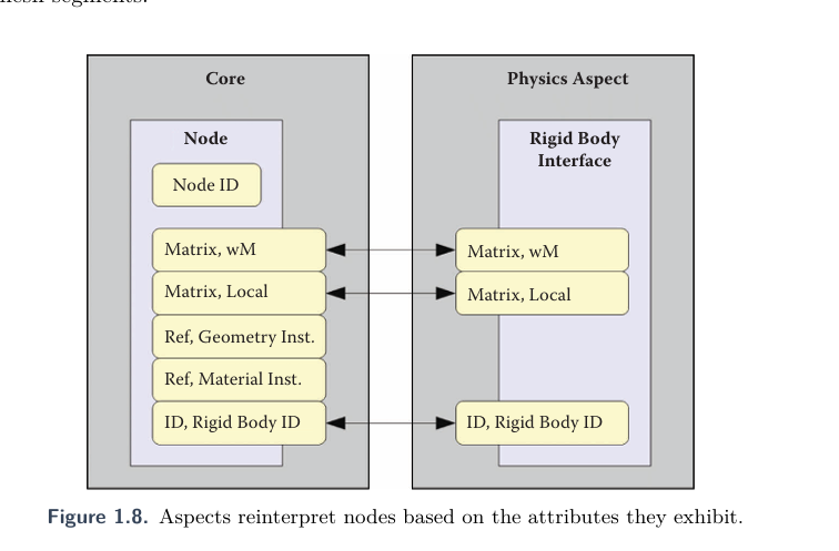 每个Aspect都会维护一个内部结构,管理他所关注的Node。一般来说Aspect会查询Node上的一些属性值来去确定哪些Node是需要他去处理的,这部分应该是在下一节【节点接口】里面解释。比如物理Aspect则会处理每个Node里面刚体相关的数据,渲染Aspect则会处理节点里面关于网格材质相关的数据。