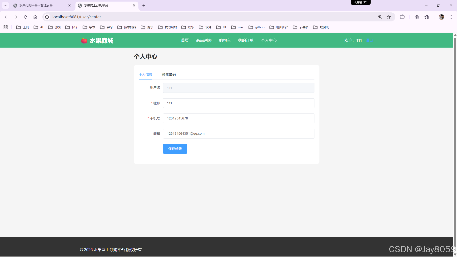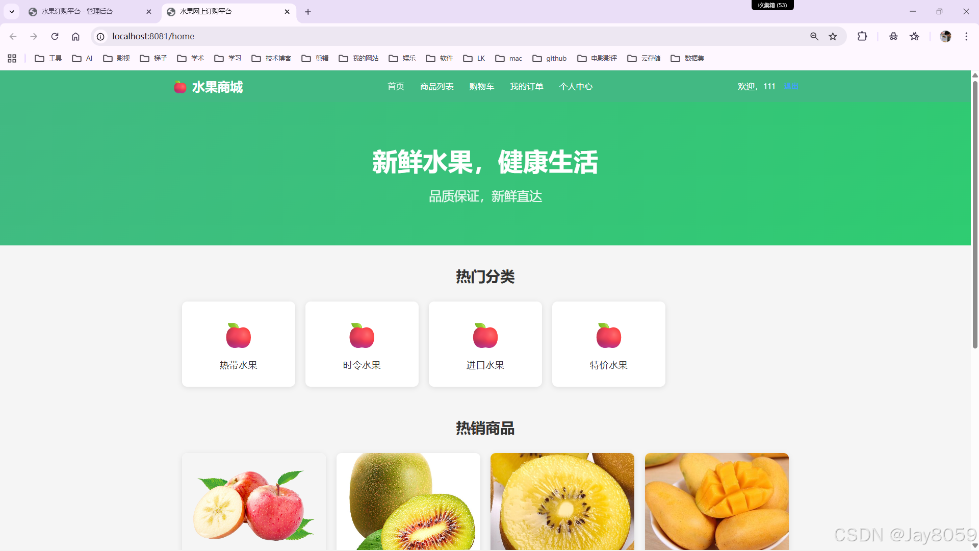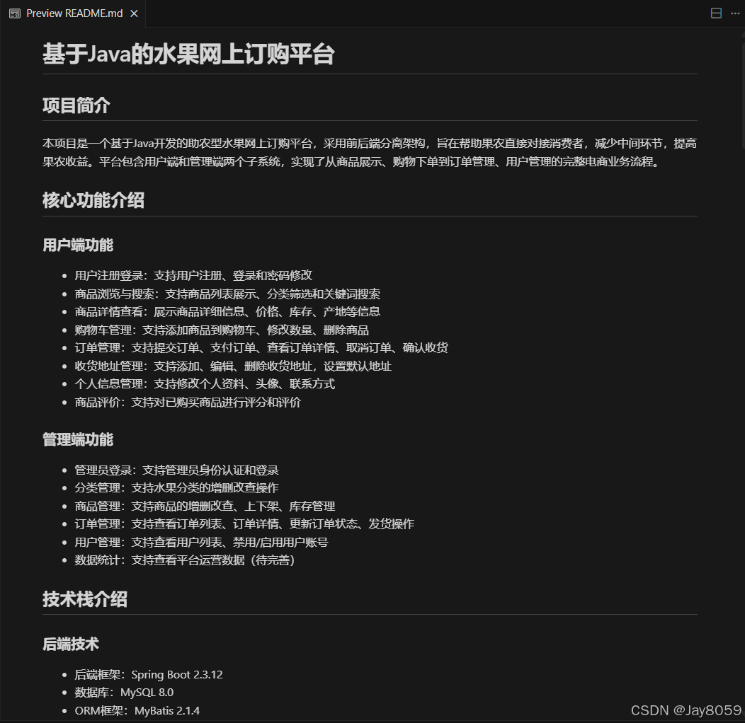 本项目是一个基于Java开发的助农型水果网上订购平台,采用前后端分离架构,平台包含用户端和管理端两个子系统,实现了从商品展示、购物下单到订单管理、用户管理的完整电商业务流程。可用于学生课设、毕设、学习交流使用。