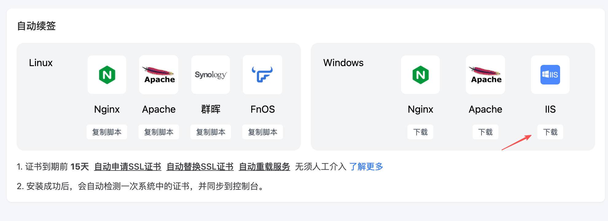 部署完证书别担心到期问题,咱们有自动续签功能!从控制台下载对应的程序包,传到服务器解压后运行,程序会自动安装好,再通过任务计划程序启动对应的任务,后续续签的事儿根本不用你管~