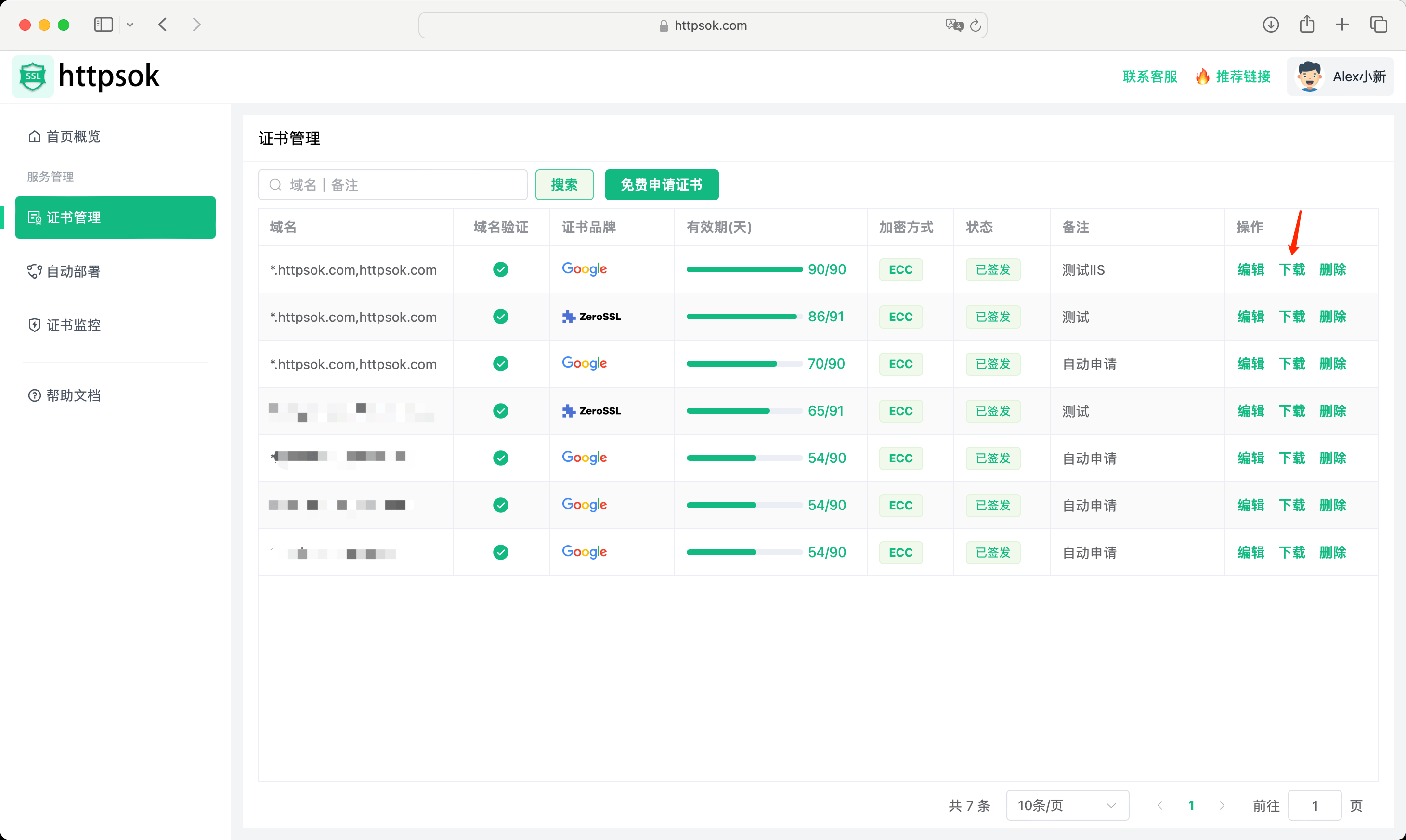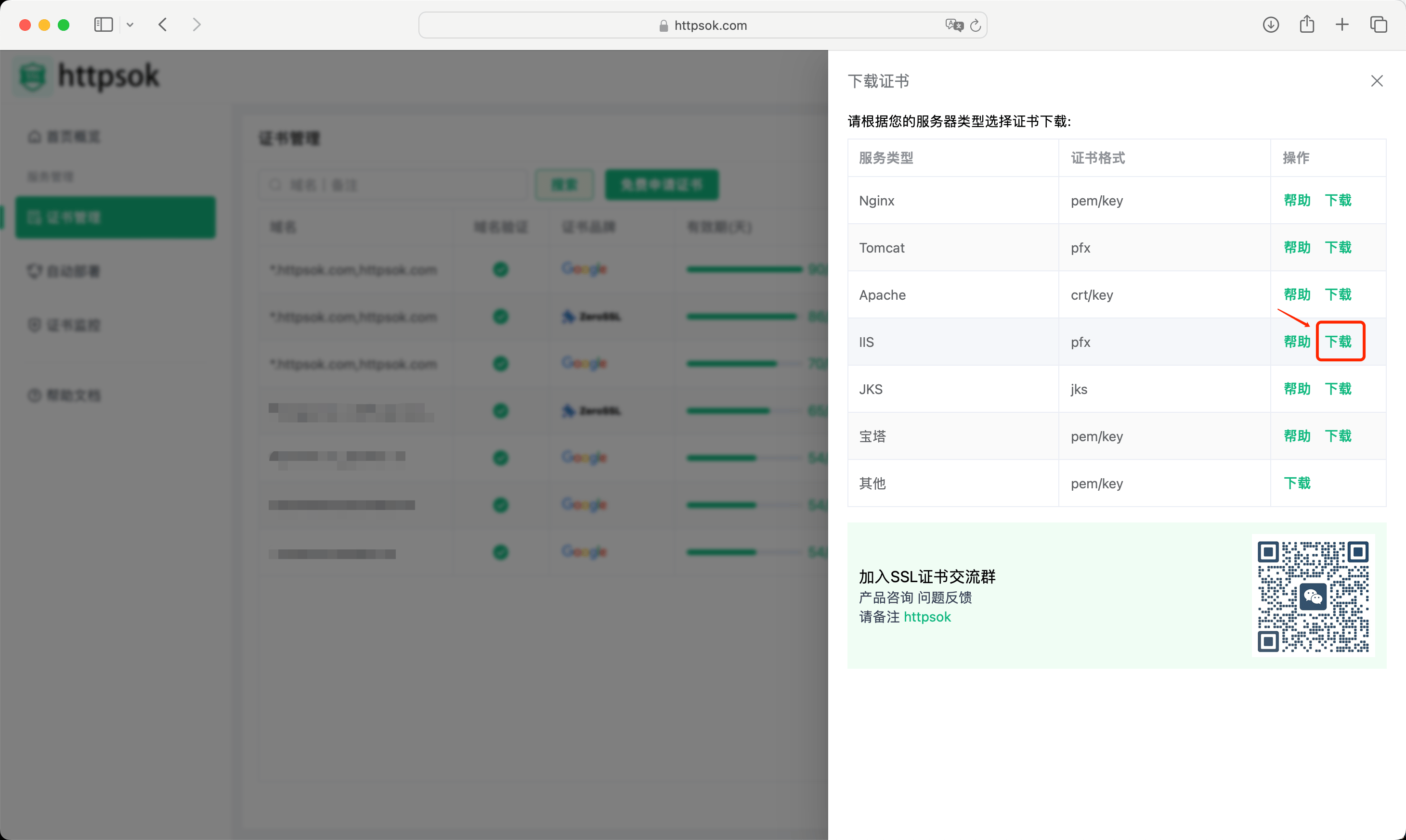 先去https://httpsok.com/控制台的【证书管理】里,选好要的证书(还能免费申请哦),点击下载后直接选"IIS证书"就行。 下载完会拿到两个文件,证书密码都乖乖存在pfx-password.txt里,不用怕记错!
