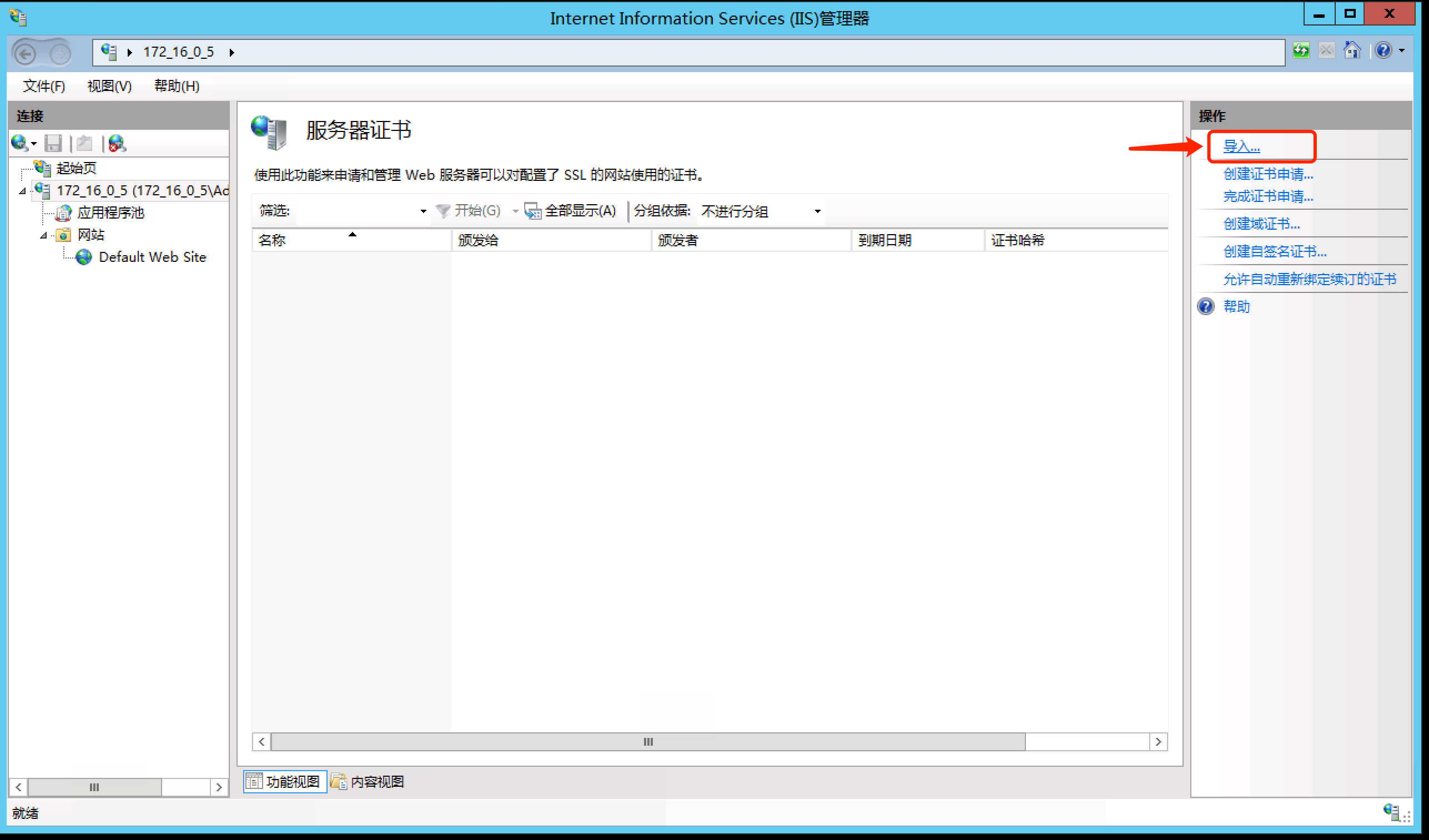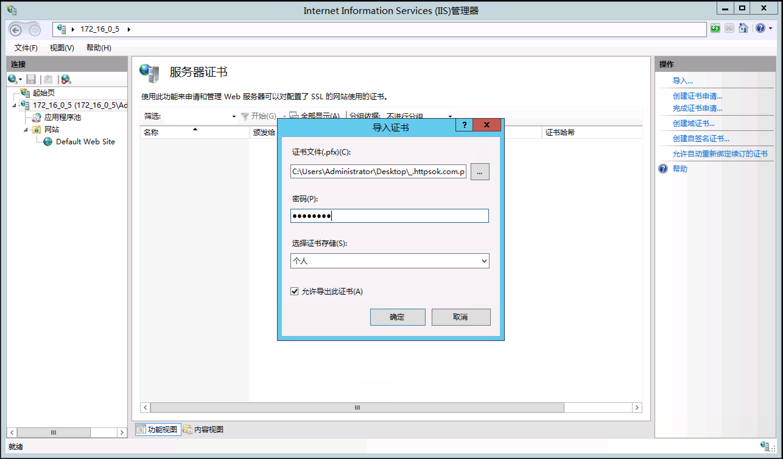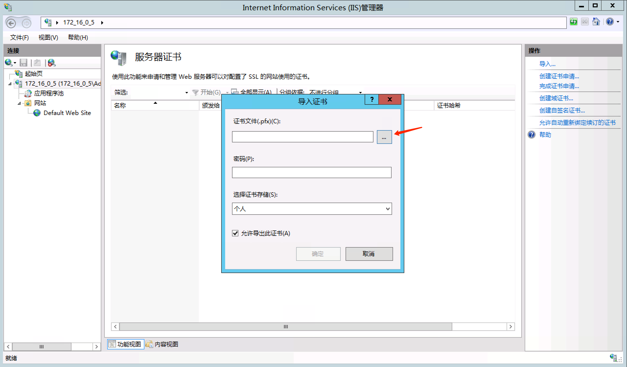 接下来导入证书:打开IIS的【服务器证书】,点"导入"选上刚传的证书文件,输入密码确认,证书就成功导入啦~