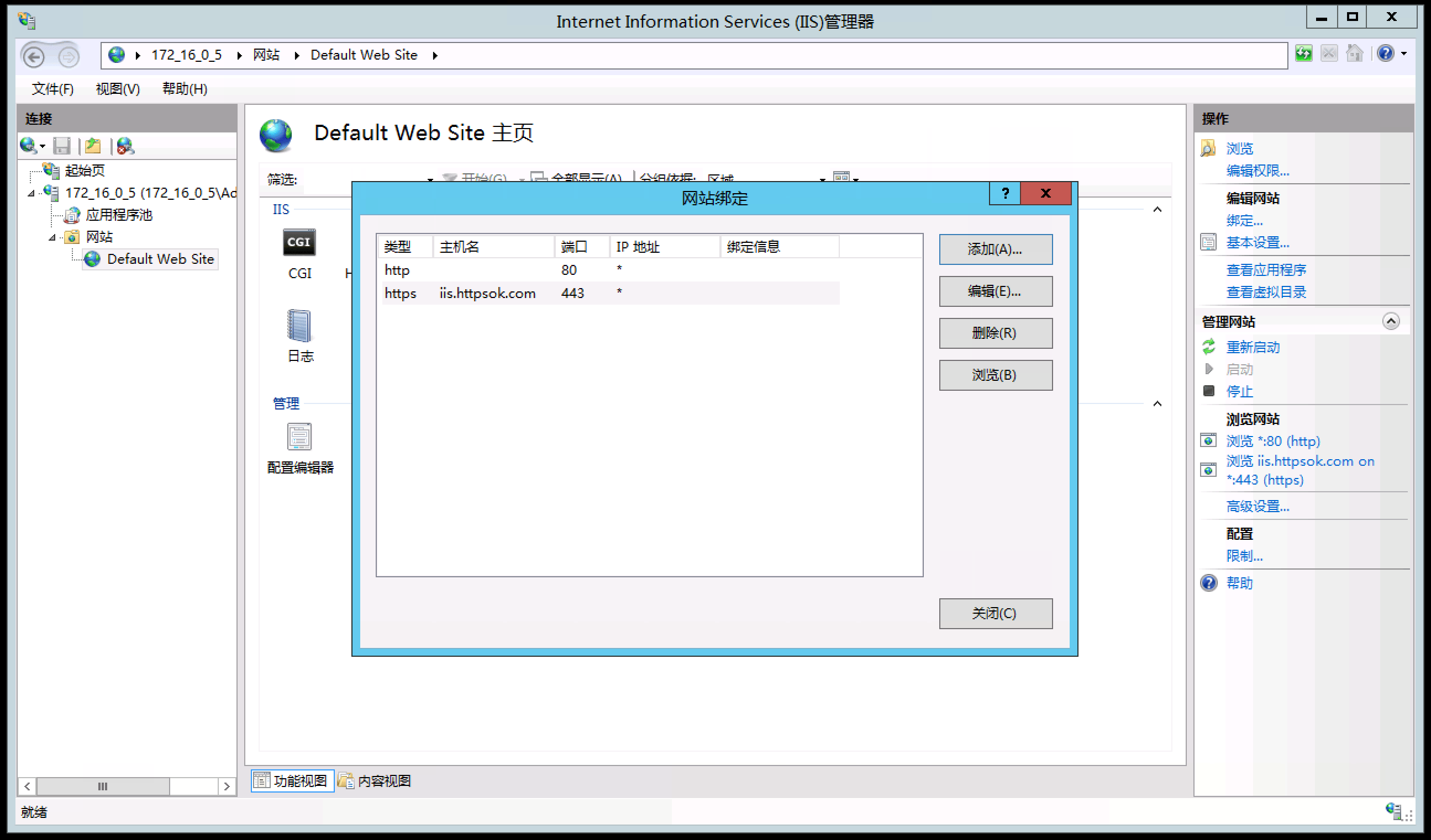 最后给站点绑定SSL:找到自己的站点点"绑定",选"添加"后把类型改成https,再选中刚导入的证书,确认就完事! 马上就能看到443端口绑定成功,用https访问网站,证书稳稳生效~