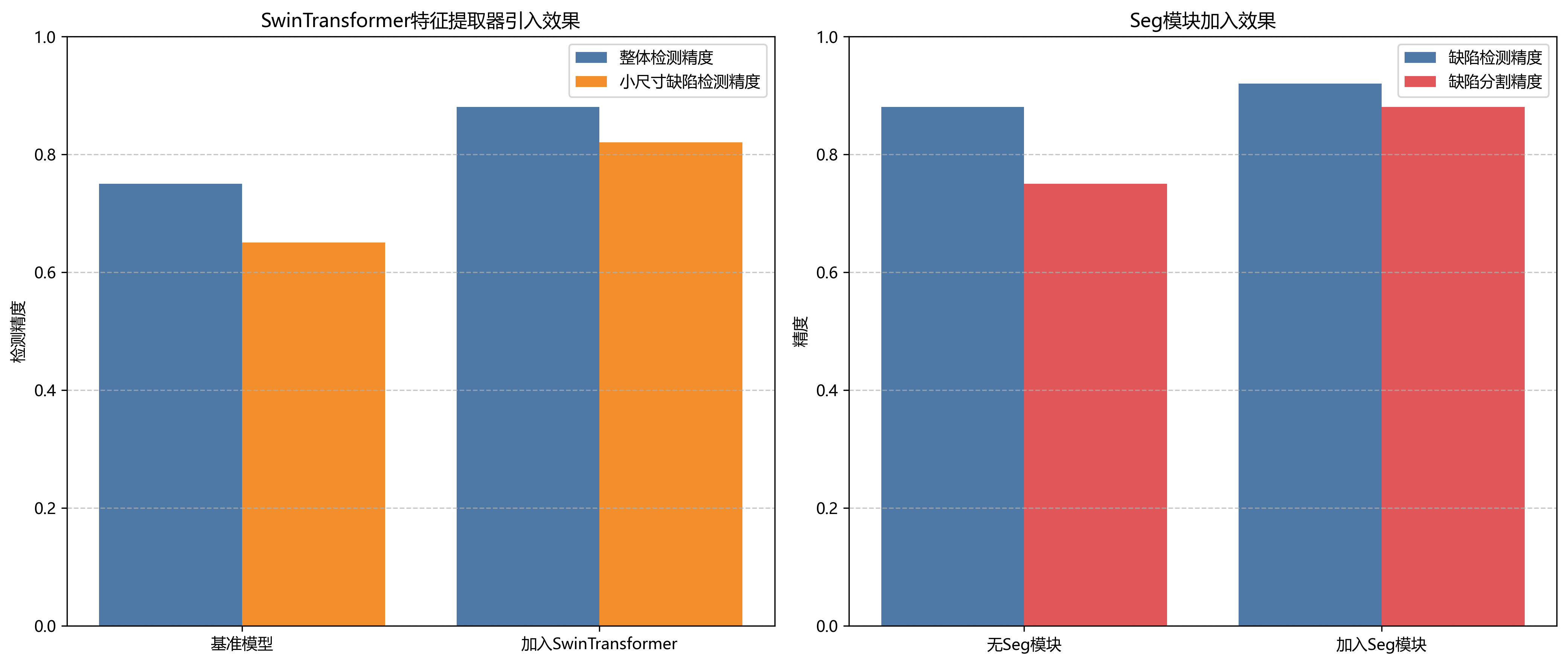 从实验结果可以看出,SwinTransformer特征提取器的引入显著提升了模型性能,特别是在对小尺寸缺陷的检测上。而Seg模块的加入进一步提高了检测精度,能够更精确地分割缺陷区域。