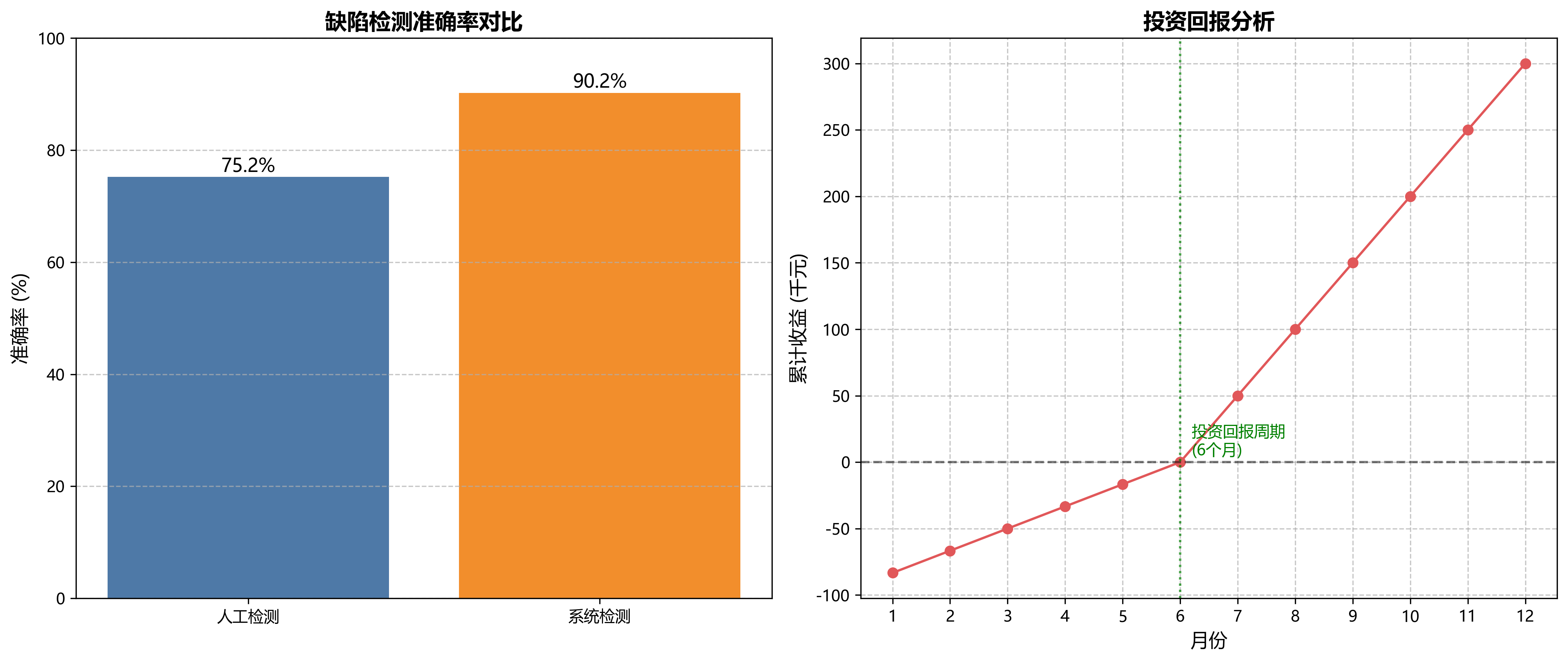 实际应用结果表明,该系统的缺陷检测准确率达到90.2%,比人工检测提高了约15个百分点,且能够24小时不间断工作,大大提高了生产效率和产品质量一致性。系统的投资回报周期约为6个月,具有良好的经济效益。