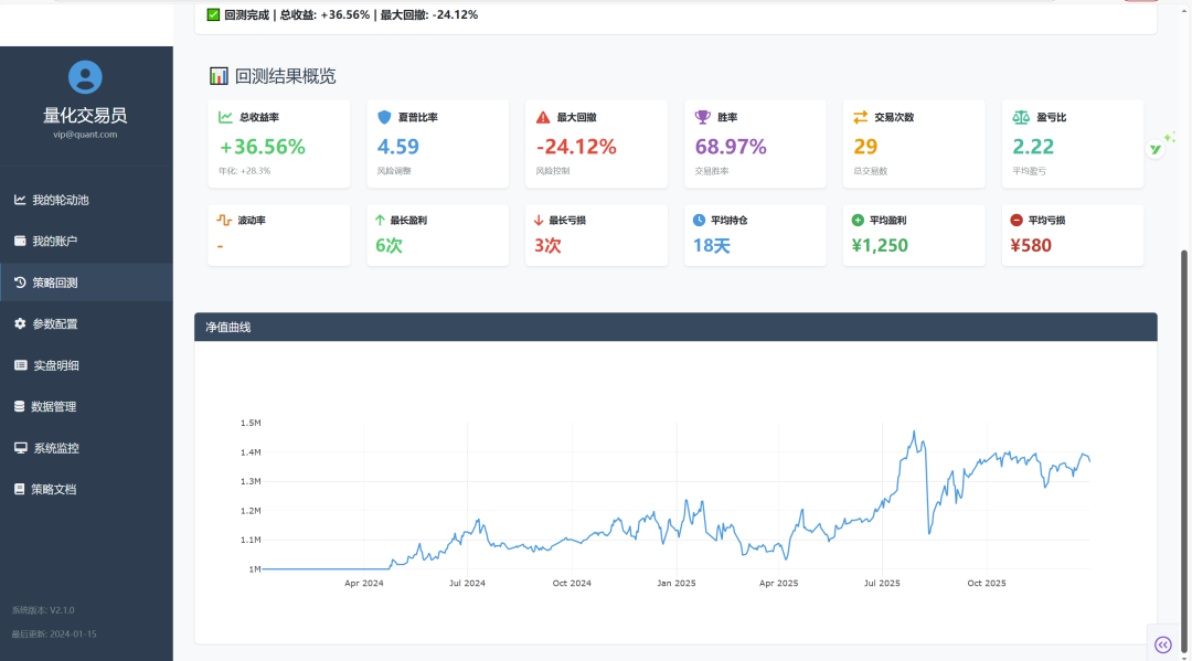 我的账户:提供了全方位的资产全景视角:通过总资产、持仓市值、可用资金、累计收益四大关键指标呈现核心财务状况;以交互式资产配置饼图直观展示各ETF持仓比例,并支持点击查看详情;同时配备动态收益曲线,实时追踪账户净值变化以评估策略表现;并清晰展示当前仓位比例,为投资决策提供直接的仓位管理参考。策略回测:构建参数化回测系统,支持灵活设置回测周期、初始资金及调仓频率等核心参数。系统通过绩效指标矩阵以卡片化形式展示12项关键指标,对策略表现进行全面评估;同时提供净值对比分析功能,将策略净值与基准净值进行多时间维度的可视化比较。所有分析均以交互式图表呈现,支持缩放、平移及数据点悬停查看,使历史验证过程直观而深入。参数配置:策略参数涵盖动量周期、调仓频率及持有数量等核心策略变量;交易参数包括手续费率、滑点及交易时间等执行细节;风险参数则聚焦于止损止盈、仓位限制与风险控制等风控规则,形成从策略逻辑、交易执行到风险管控的完整闭环。实盘明细:提供交易全流程监控。支持按时间、交易类型及ETF代码等多维度精准筛选交易记录;采用清晰的状态标记体系,有效区分买入/卖出、盈利/亏损以及完成/待处理等关键状态;完整记录每笔交易的时间、价格、数量及金额,实现交易详情可追溯;同时自动计算并展示每笔交易的盈亏情况,为绩效归因提供精确数据支撑。数据管理:实现一体化数据管理。支持每日、每周及每月定时更新的自动配置计划;集成新浪财经、东方财富、聚宽等多类主流数据源;实时监控各类数据的更新状态,并通过清晰的状态标识进行可视化反馈;同时提供手动控制接口,允许用户按需触发数据的立即更新,保障数据时效性与系统灵活性。