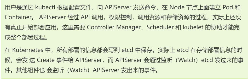 注意:在创建 Pod 的工作就已经完成了后,为什么 kubelet 还要一直监听呢?原因很简单,假设这个 时候 kubectl 发命令,要扩充 Pod 副本数量,那么上面的流程又会触发一遍,kubelet 会根据最新的 Pod 的部署情况调整 Node 的资源。又或者 Pod 副本数量没有发生变化,但是其中的镜像文件升级 了,kubelet 也会自动获取最新的镜像文件并且加载。