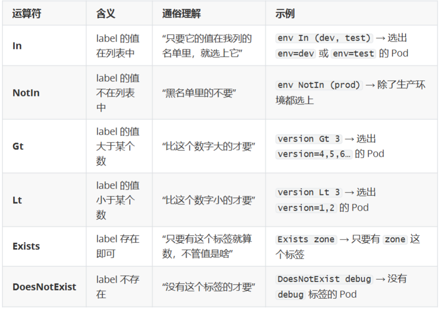 In、NotIn、Exists、DoesNotExist、Gt、Lt