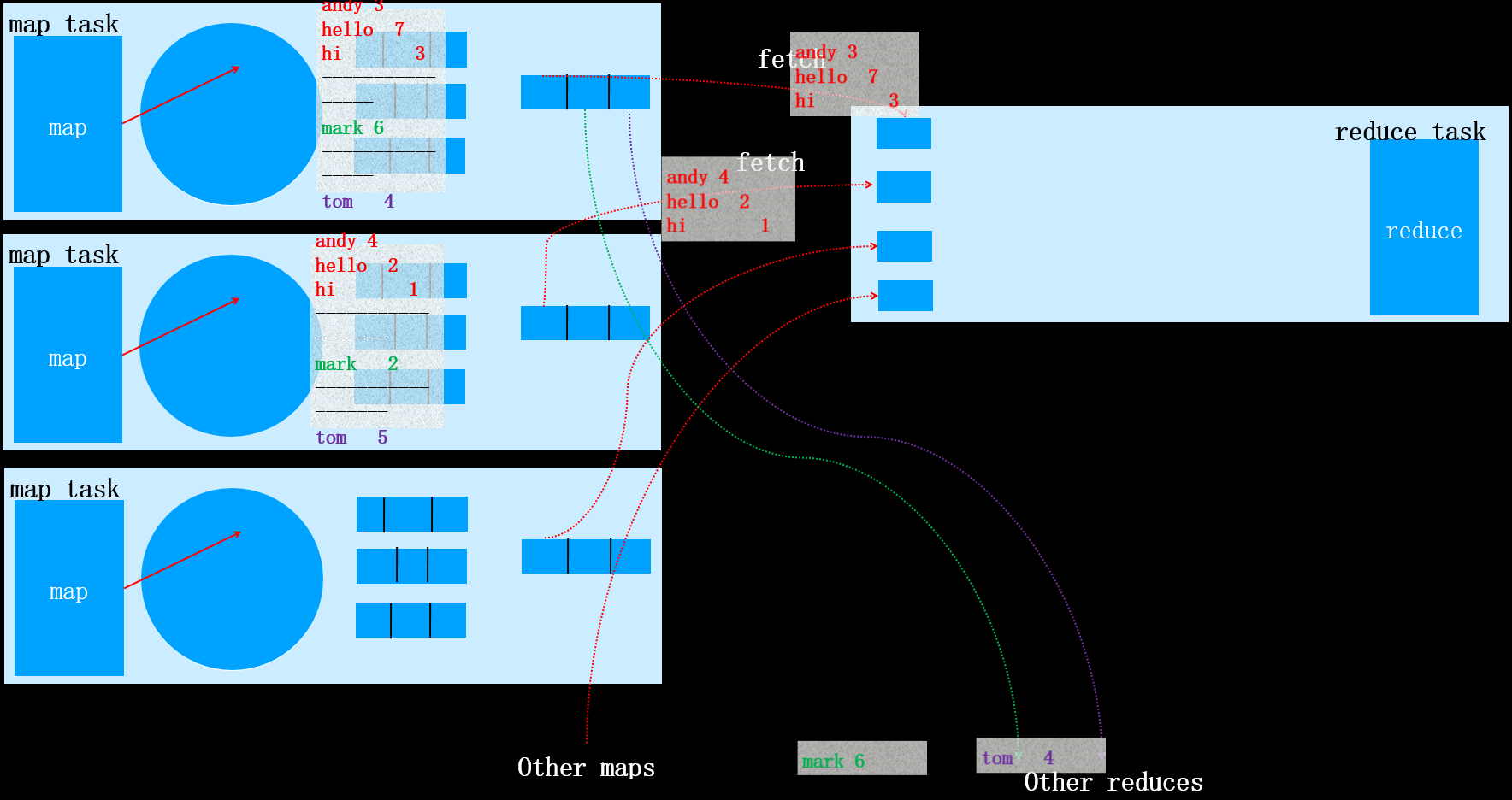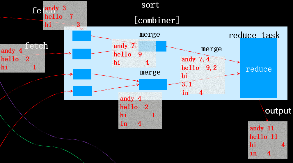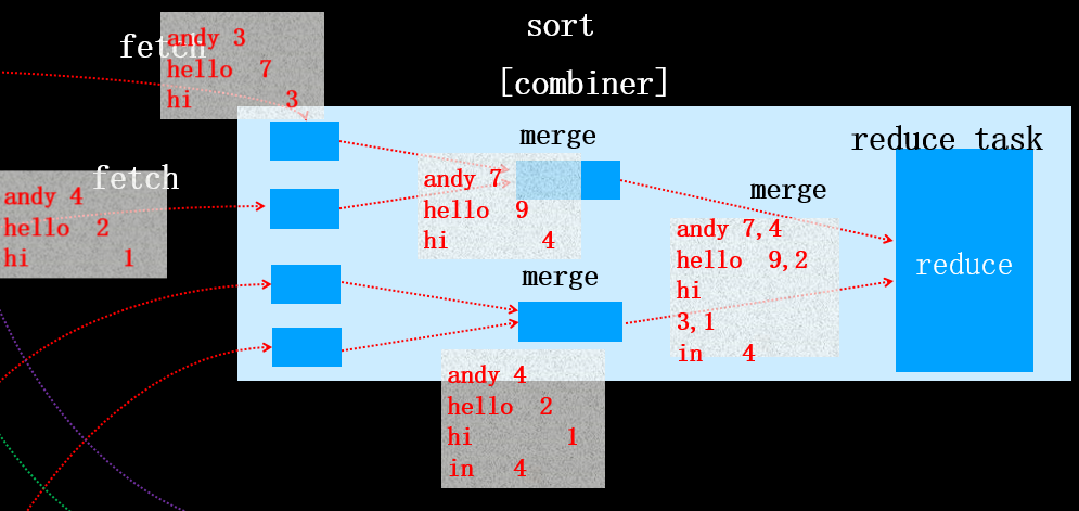 这是因为如果N<3时,执行combiner虽然减少了文件的大小,但是同时产生了一定的系统开销。由于减少的文件大小不大,权衡利弊后,确定N<2时不在执行combiner操作。当该map task全部执行完之后,对应的reduce task将会拷贝对应分区的数据(该过程称为fetch)。