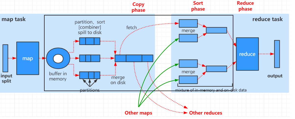 官方给的定义:系统执行排序、将map输出作为输入传给reducer的过程称为Shuffle。通俗来讲,就是从map产生输出开始到reduce消化输入的整个过程称为Shuffle。如下图用黑线框出的部分: