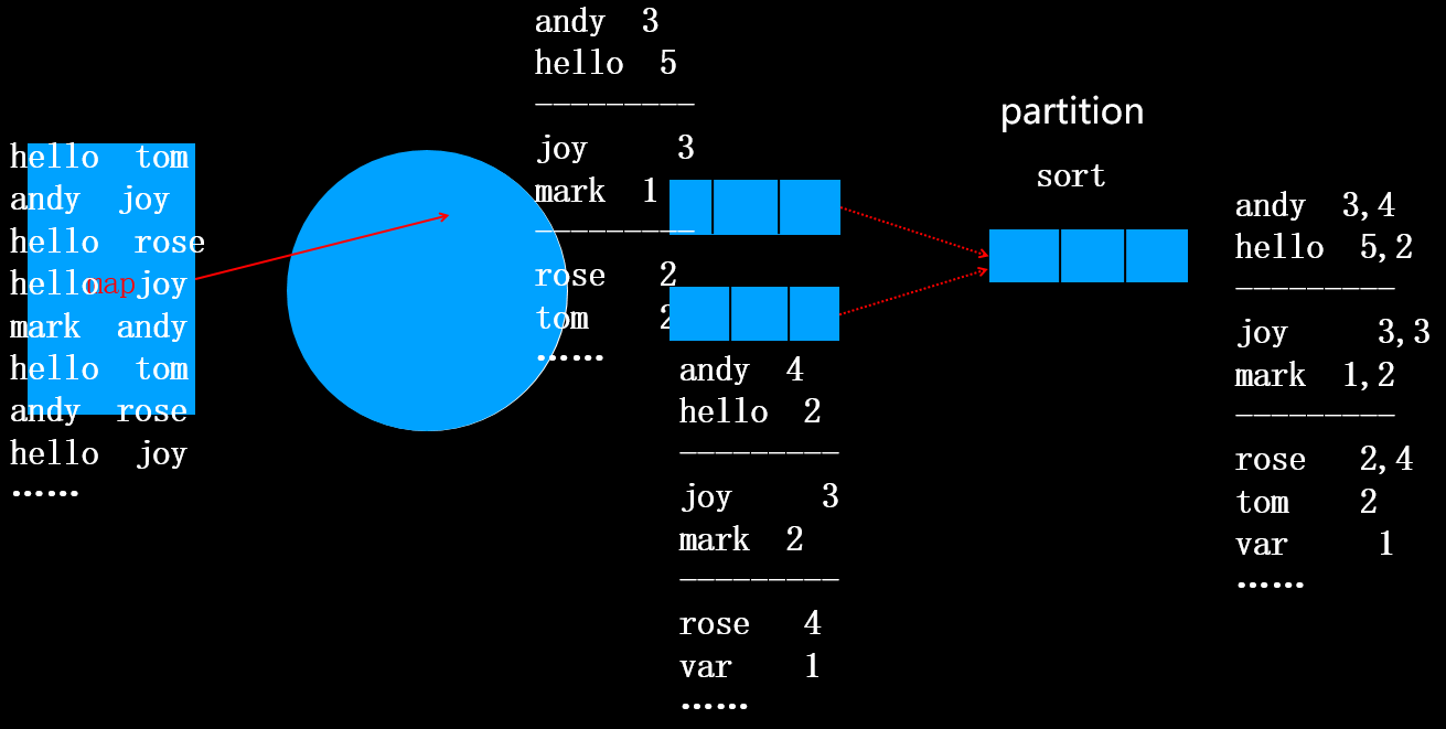 在分区(分区规则:按首字母分四个区,分别为a-i,j-q,r-z,其它)的过程中,会将相同的单词合并到一起,将出现次数用逗号隔开,如上图所示。注意此时还没有排序。