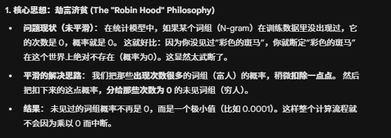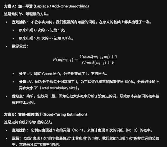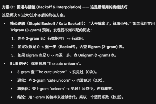 J&M 这本书提到的解决方案,本质上就是承认**"训练数据永远是不够的"。 通过平滑(Smoothing),特别是回退(Backoff)**机制,模型学会了在缺乏精确的高阶信息(N很大)时,灵活地借用低阶信息(N很小)来填补空白,从而解决了"零概率"问题。