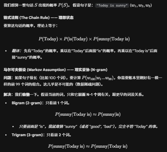 定义: 它是一个通过计算概率来判断一句话是否"正常"的数学模型。 它不关心这句话的语法对不对(主谓宾),也不关心这句话的意思(语义),它只关心:"根据历史数据,这几个词凑在一起出现的概率有多大?"