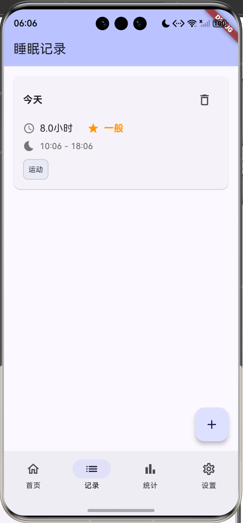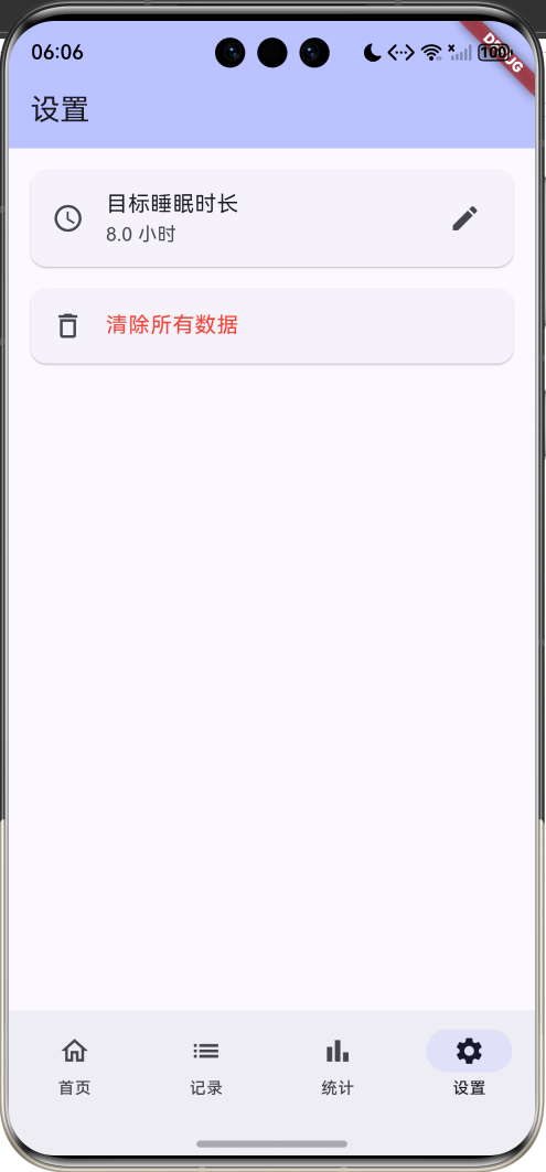 id:记录唯一标识(使用时间戳)bedTime:入睡时间wakeTime:起床时间sleepQuality:睡眠质量评分(1-5星)notes:用户备注信息factors:影响睡眠的因素列表