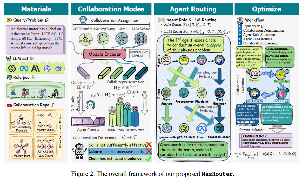 再次回顾一下 MASR 是指:给定一个查询 Q \mathcal{Q} Q、一个 LLM 池 M \mathcal{M} M、 一个角色库 R \mathcal{R} R 和一个协作模式库 T \mathcal{T} T,一个理想的 MAS 路由器应能: