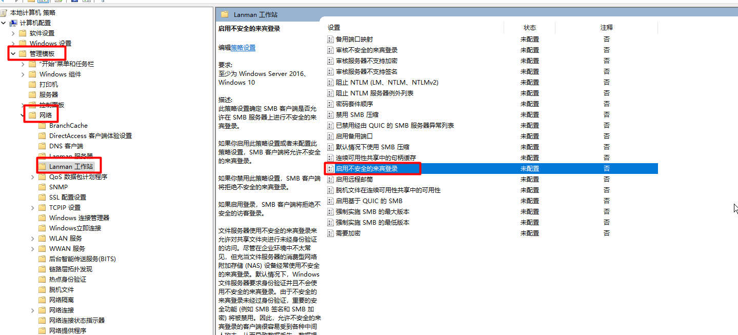 计算机配置 → 管理模板 → 网络 → Lanman工作站。