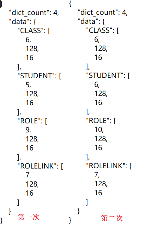运行上述程序,保存第一次的数据库表信息,然后向数据库表中插入数据,再次运行程序保存第二次数据,如下图所示,可以看出前后两次的数据库表变化,后续学习并测试如何通过程序自动比较前后两次的数据库表信息变化。