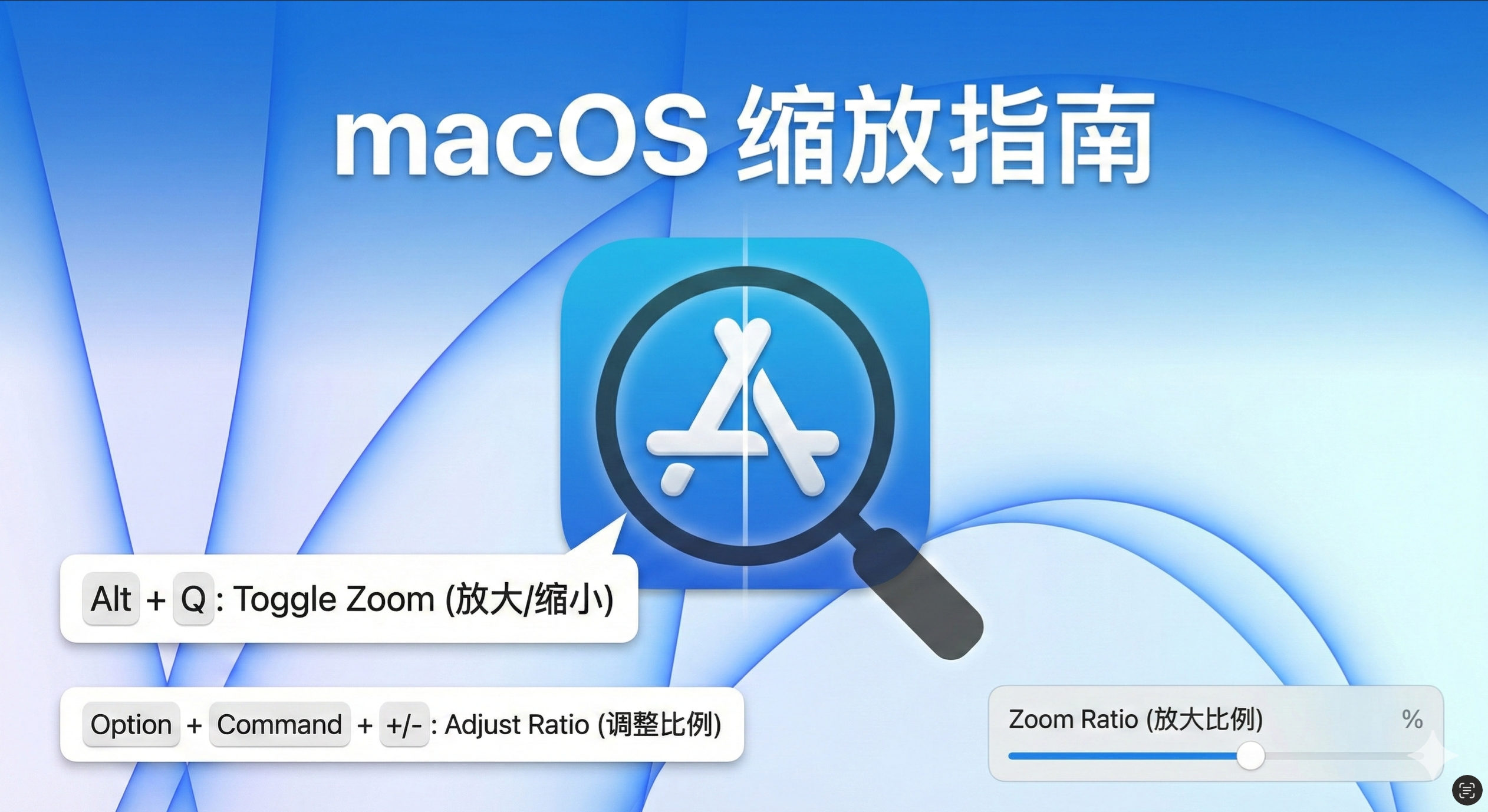 建议你先试试默认的 Option + Command + 8,这是最标准的"开关式"缩放操作。如果不习惯,去键盘设置里把它改成 Ctrl + Alt + Z 会顺手很多。