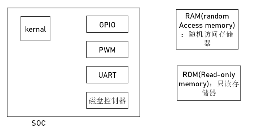 SOC(片上系统):kearnal(内核),UART,GPIO,PWM,磁盘控制器...