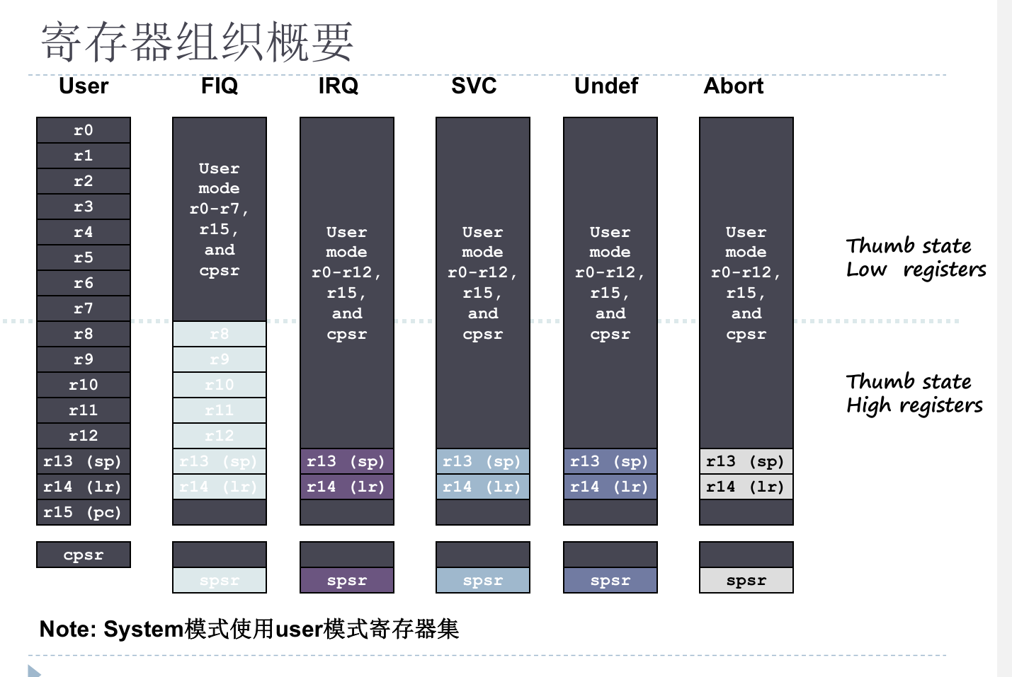 深灰色块:表示该模式和 User 模式共享这些寄存器。