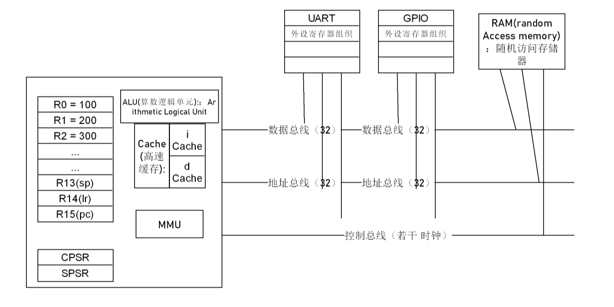像是GPIO、UART这些之中不属于系统内核内部的寄存器,也会同RAM一样挂接在总线上