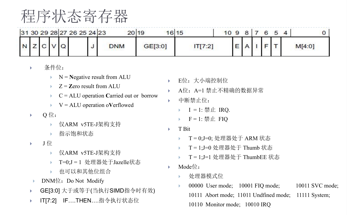 N:表示上一次ALU最近的一次算数逻辑运算是否是负数(符号位)