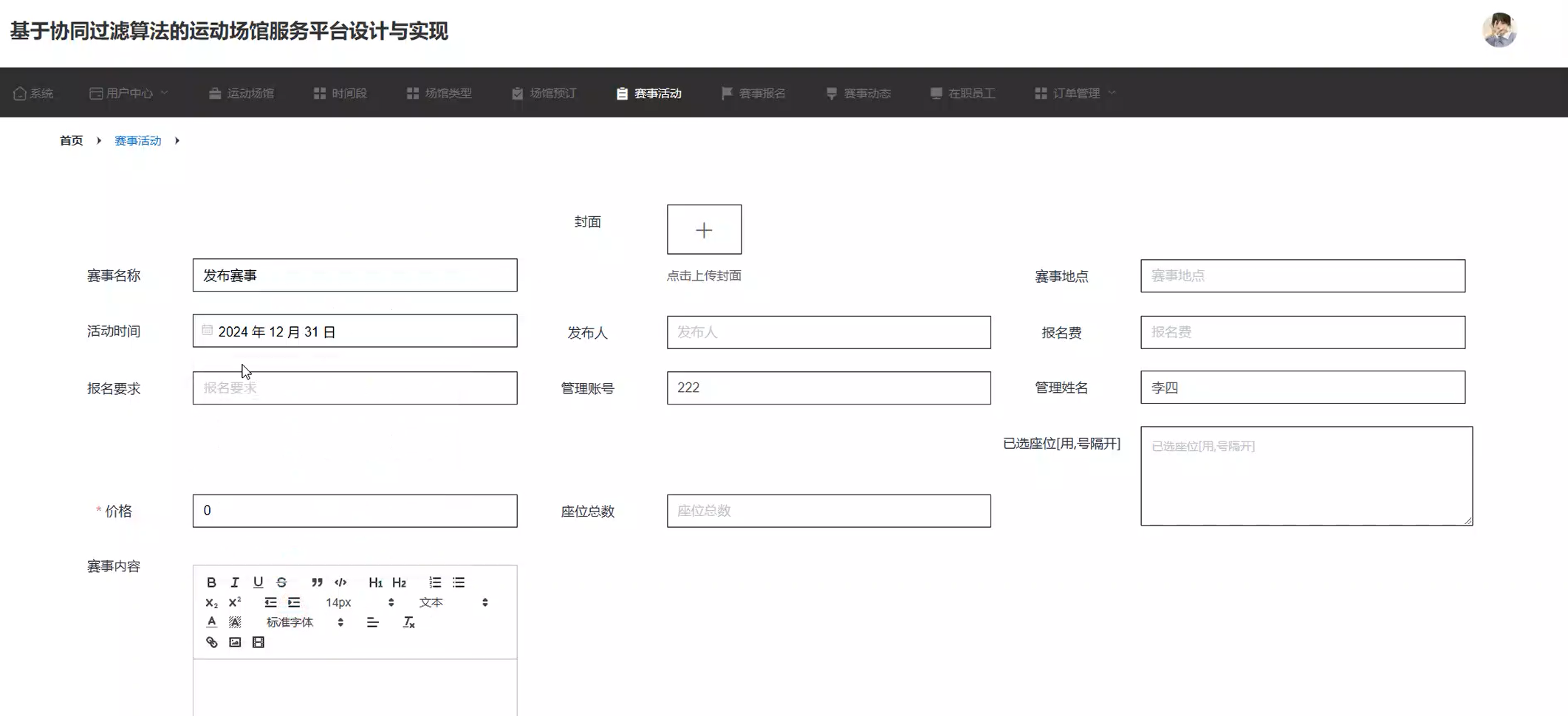 该系统具有多维价值。对用户而言,可随时随地通过微信小程序完成场馆查询、在线预约支付等操作,还能记录运动数据生成报告,精准匹配运动需求,增强运动积极性。对场馆管理方,能实时更新场地状态,处理订单,通过数据分析优化资源配置,提高场地利用率,降低人工管理成本。从行业层面看,推动体育行业数字化转型,提升整体服务水平。此外,为微信小程序在体育领域的应用提供实践经验,促进智慧体育发展。