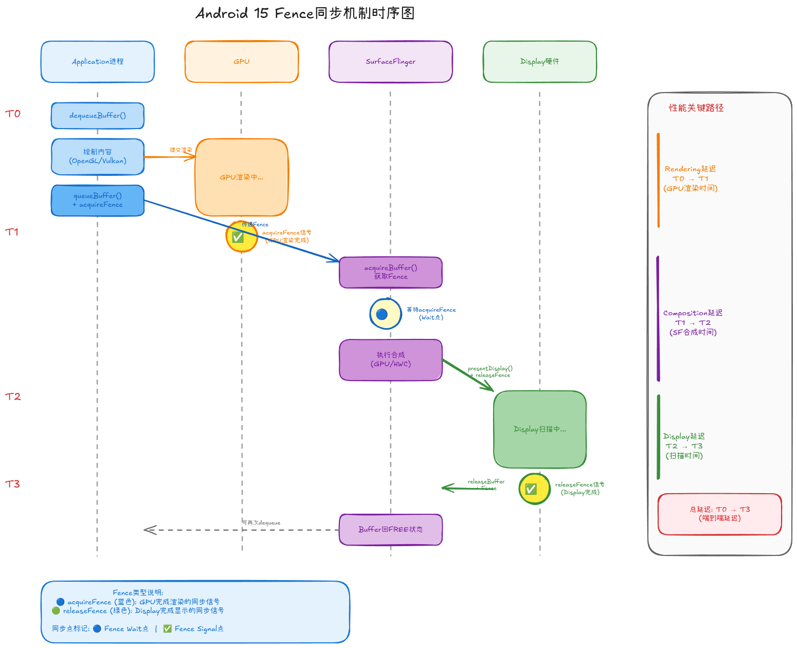 - Fence同步机制协调GPU/SurfaceFlinger/Display的异步操作,确保数据一致性