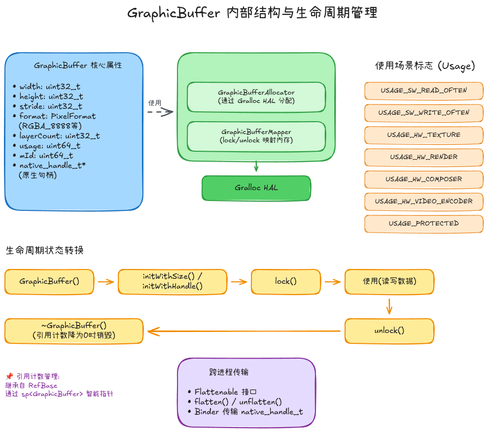 GraphicBuffer是对共享内存图形缓冲区的封装,提供了跨进程传递和内存管理的能力。