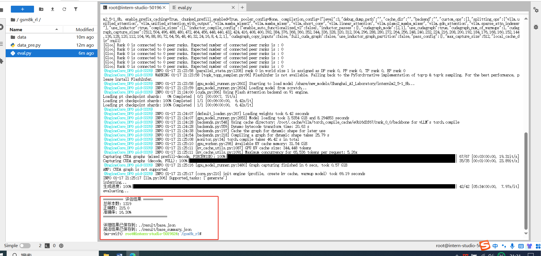 测评结果如下准确率从16%提升到34%,如果需要继续提高,可以在训练时适当增加epoch轮次