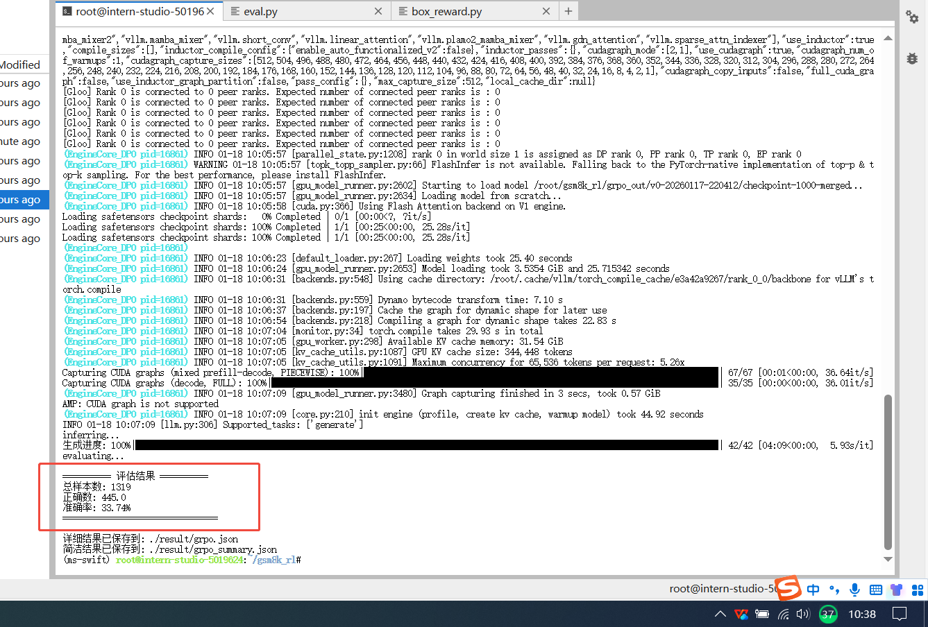 accuracy和一个自定义的box_reward。 - 使用了 gsm8k 训练集的 4000/7473 条样本,训练 2 epoch。