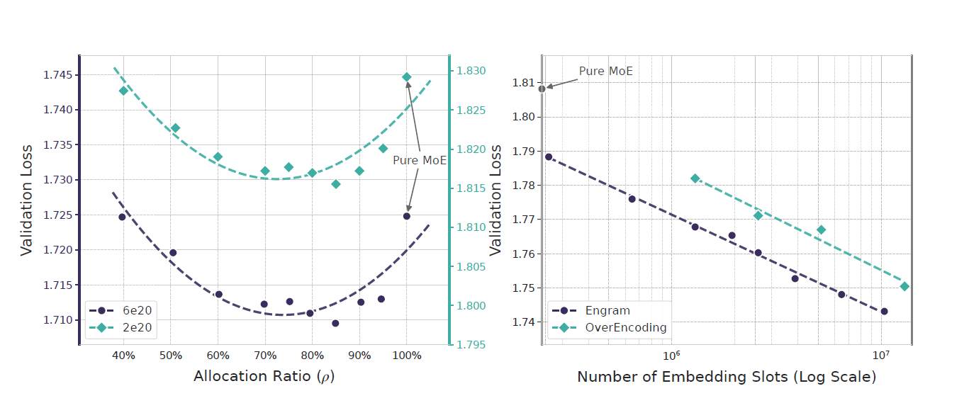 - 结果:验证损失呈现清晰U型曲线------当ρ=75%-80%(即20%-25%稀疏参数分配给Engram)时,损失最低,性能最优。