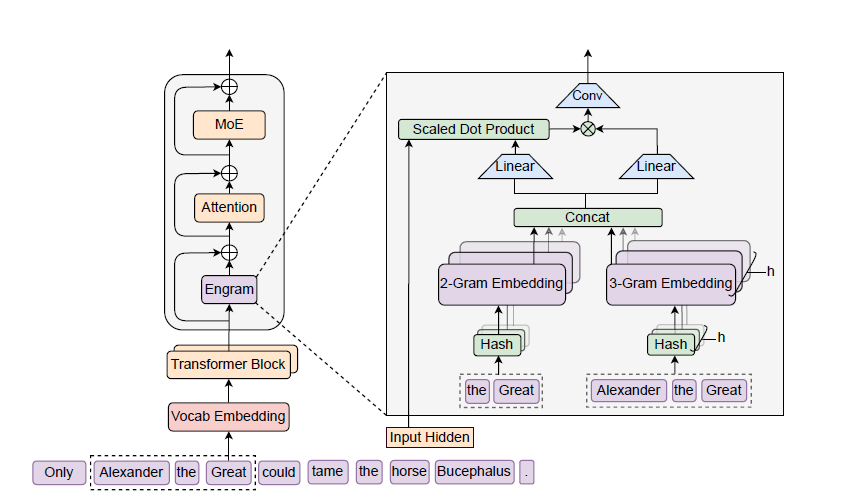 传统N-gram因"存储爆炸"(128k词表的3-gram组合达128k³种)与"多义性"(如"Apple"可指水果或公司)被边缘化,Engram通过以下设计实现现代化升级: