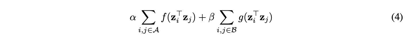 其中,( f ) 和 ( g ) 是光滑、连续的函数,( z_i ) 是通过直接优化(例如嵌入查找)获得的节点表示,而 ( A ) 和 ( B ) 是节点对的集合。需要注意的是,在许多情况下,这些方法的实际代码实现中,节点会关联两个唯一的嵌入向量,并且 ( f ) 和 ( g ) 中点积的参数来自不同的嵌入查找(例如 [11, 28]),但这并不会从根本上改变学习算法。大多数方法还会将学习到的嵌入归一化为单位长度,因此我们也假设进行了这种后处理。