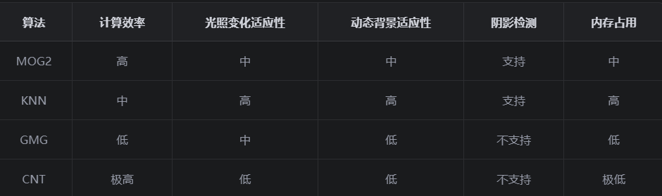 OpenCV提供了多种背景减法算法,每种算法都有其独特的设计思路和适用场景: